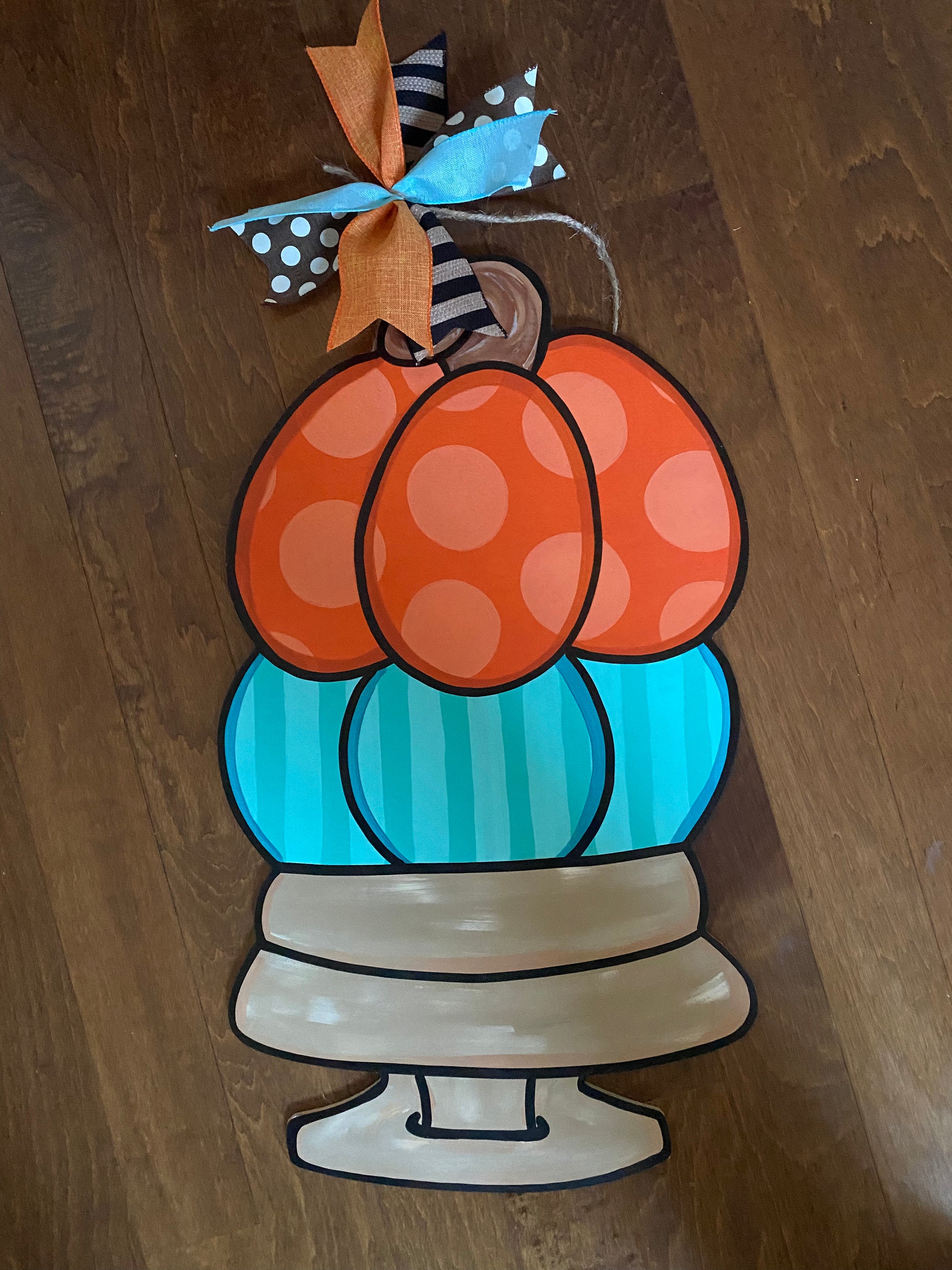 This cute little fall pumpkin topiary door hanger is sure to brighter your door.
